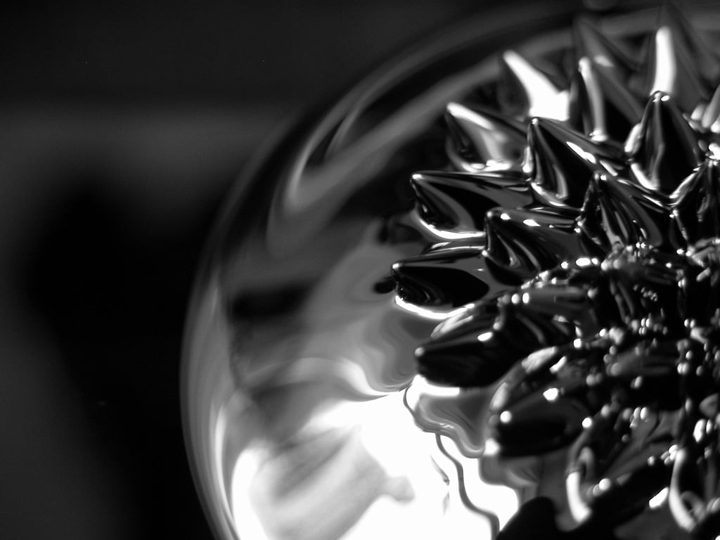 Ferrofluids consist of ferromagnetic nanoparticles suspended in a fluid. When subjected to strong magnetic fields, they develop a distinctive peak-and-valley formation due to the normal-field instability. The shape is a result of minimizing the magnetic energy of the fluid. Both gravity and surface tension resist the formation of these peaks. Ferrofluids, in addition to appearing in art exhibits, can be used as liquid seals, MRI contrast agents, and loudspeaker cooling fluids. (Photo credit: Maurizio Mucciola)