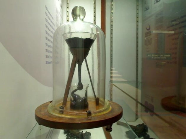 Sometimes everyday materials are more fluid than they seem. In 1927, Professor Thomas Parnell of the University of Queensland started what is now the longest continuously running laboratory experiment when he filled a sealed glass funnel with a sample of heated tar pitch. After allowing 3 years for the pitch to settle, the funnel’s stem was unsealed and the pitch has been slowly dripping ever since. Now, over 80 years later, the ninth drop is still just forming. No one has witnessed the fall of a pitch drop but the odds are good that someone will catch the ninth drop now that it has its own webfeed. The experiment, which won an Ig Nobel Prize in 2005, demonstrates the incredibly high viscosity of pitch, which the researchers estimated at 11 orders of magnitude larger than water at room temperature. (submitted by jshoer)