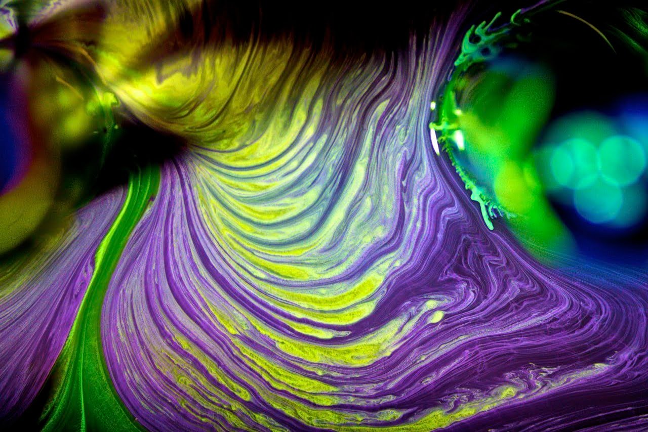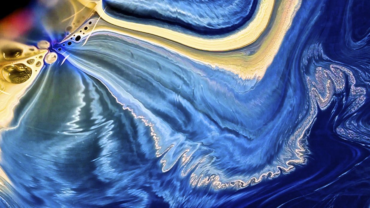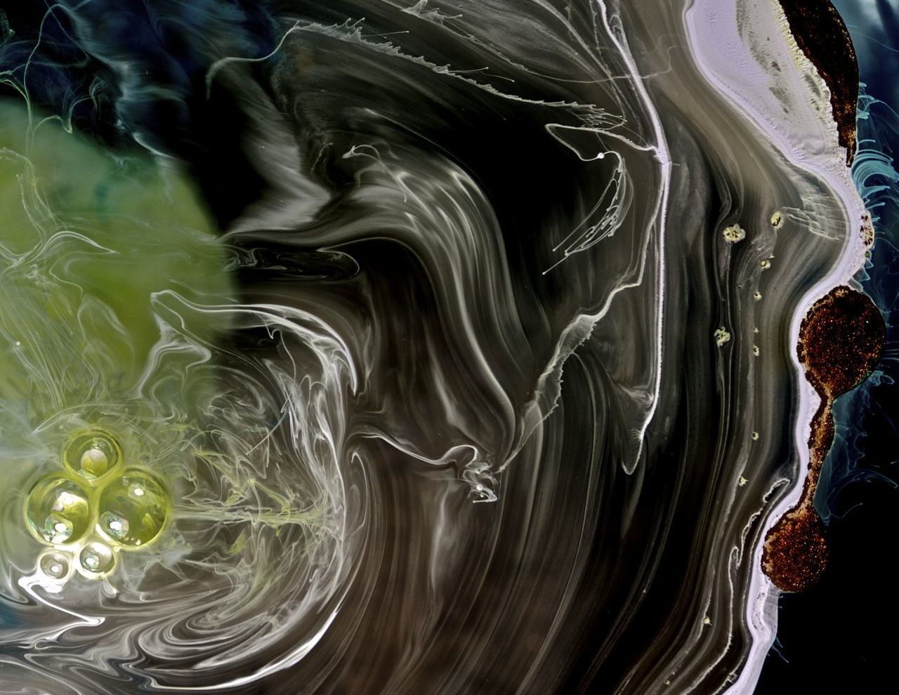Exeter University artist-in-residence Pery Burge uses ink, water, soap films, and other fluids to create her spectacular “artistic flow visualization”. Looking closely, one sees the influence of bubbles, vortices, diffusion, and many fluid instabilities, all combined to create psychedelic and dream-like landscapes. For more on her work and additional galleries, see her website Chronoscapes. (Photo credit: Pery Burge)