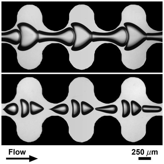 Surface tension usually constrains bubbles to the smallest area for a given volume – a sphere – but sometimes other forces generate more complicated geometries. The images above show bubbles flowing through microfluidic channels filled with a highly viscous carrier fluid. The bubble size and packing affects the shapes they assume, but so does the geometry of the channel. The narrow constrictions accelerate the flow, elongating the bubbles, whereas the wider channel regions slow the carrier fluid and squish the bubbles together. (Image credit: M. Sauzade and T. Cubaud (Stony Brook University))