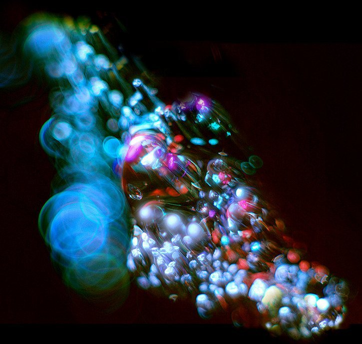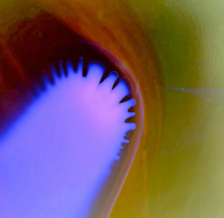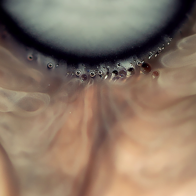 Janet Waters’ abstract photography is full of effects created with fluid dynamics. Diffusion merges different fluids, and gradients in surface tension drive interfacial flows. Changes in density and viscosity produce fingers and streaks and all manner of forms. Be sure to check out her photostream for many more examples of fluids as art. (Photo credits: J. Waters)