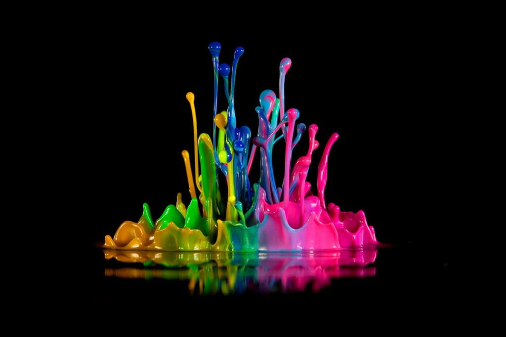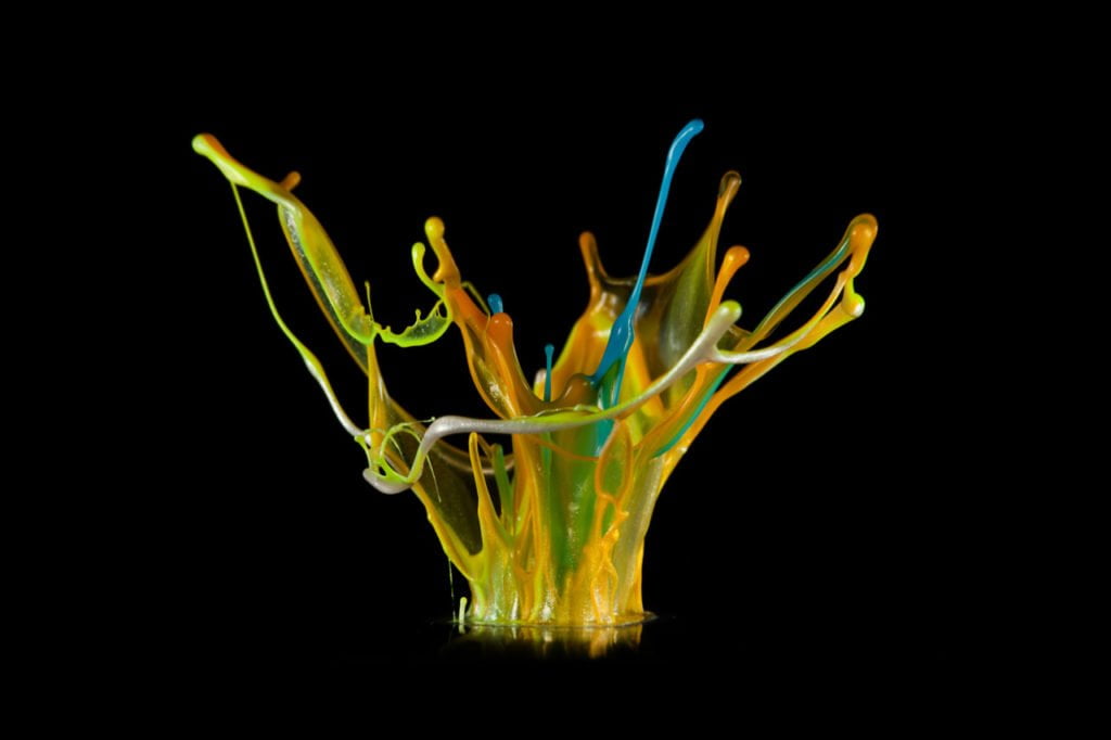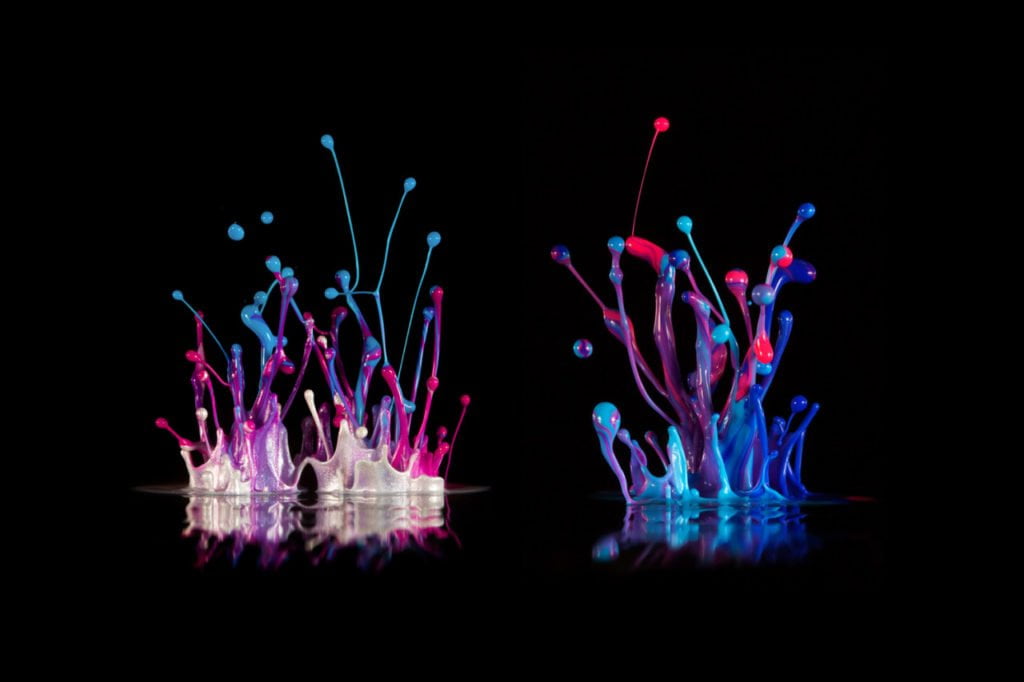 Paint seems to dance and leap when vibrated on a speaker. Propelled upward, the liquid stretches into thin sheets and thicker ligaments until surface tension can no longer hold the the fluid together and droplets erupt from the fountain. Often paints are shear-thinning, non-Newtonian fluids, meaning that their ability to resist deformation decreases as they are deformed. This behavior allows them to flow freely off a brush but then remain without running after application. In the context of vibration, though, shear-thinning properties cause the paint to jump and leap more readily. For more images, see photographer Linden Gledhill’s website. (Photo credit: L. Gledhill; submitted by pinfire)