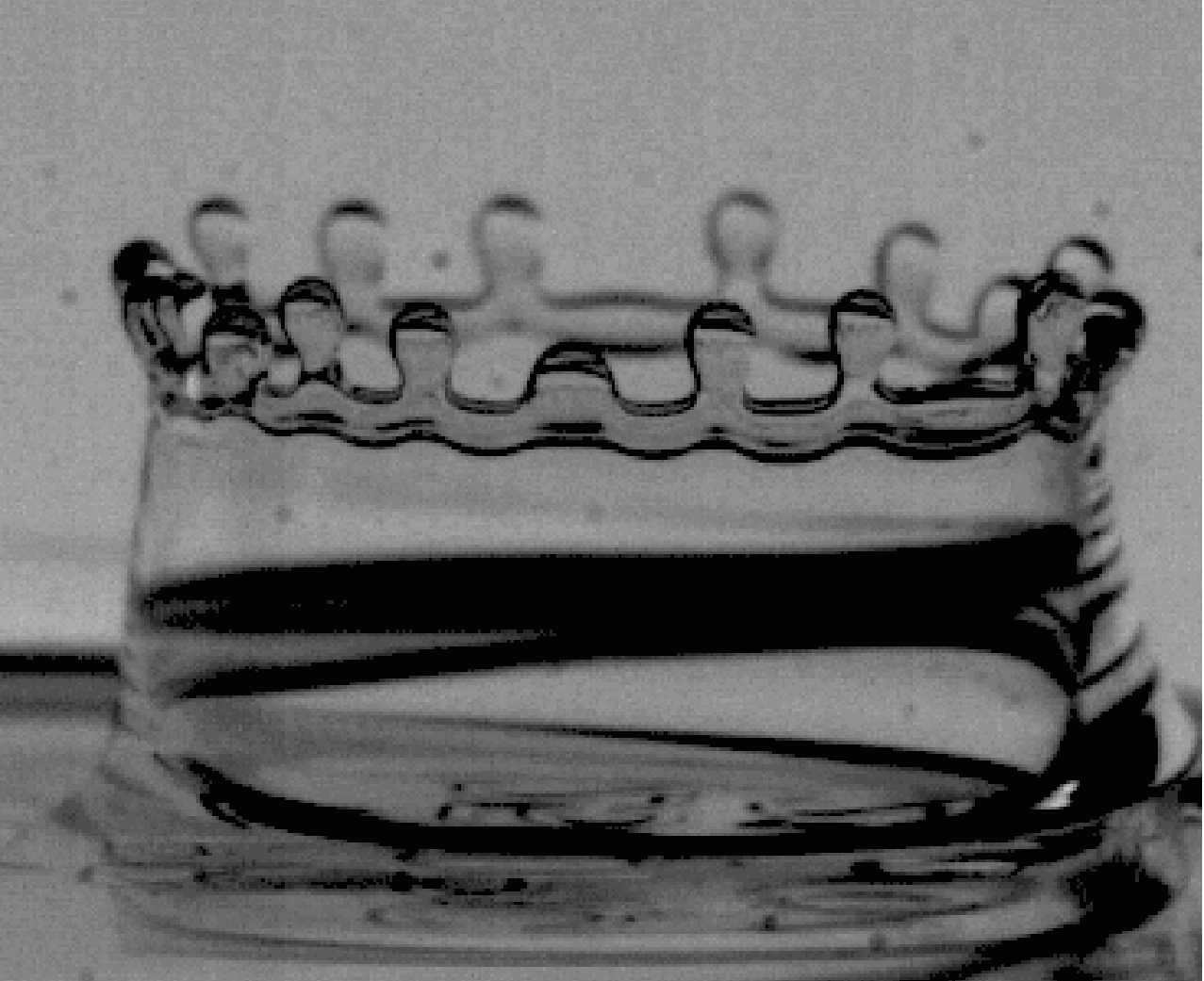 When a drop falls on a liquid film, its impact drives a thin liquid sheet called the ejecta upward and outward from the point of impact. Within milliseconds, tiny perturbations develop in the ejecta and begin growing exponentially. These become the distinctive spikes of the crown. The momentum from the impact drives the ejecta and spikes further outward until it overcomes surface tension’s ability to hold the liquid crown together. Tiny droplets escape the crown before the ejecta comes crashing down. The whole process takes only a few hundred milliseconds from start to finish. (Photo credit: S. Jung et al.)