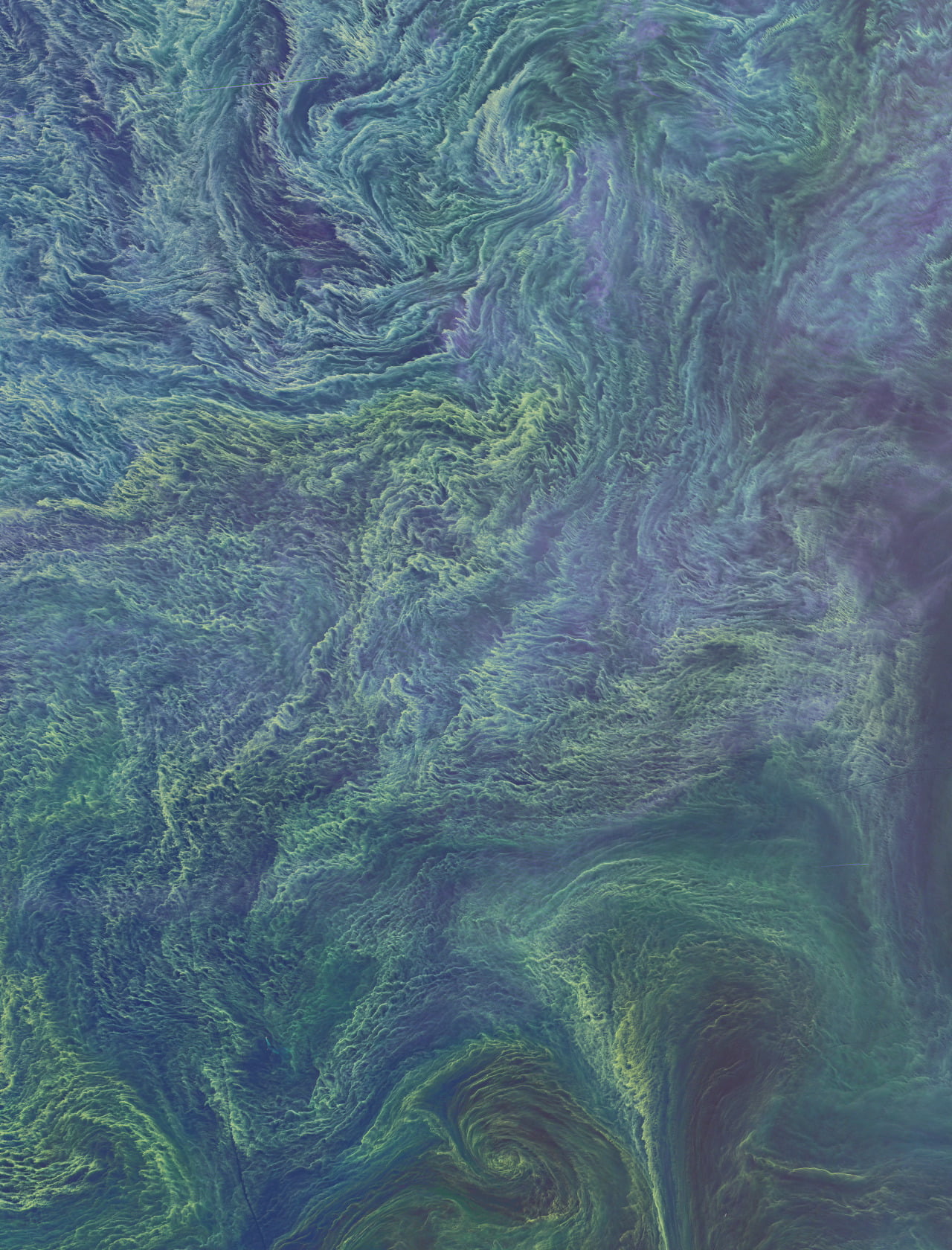This incredible false-color satellite image shows a cyanobacteria phytoplankton bloom in the Baltic Sea. The image is roughly 900 km across and is beautifully detailed. Check out the full resolution version. The tiny phytoplankton act like tracer particles in the flow, sketching out the massive whorls as well as the tiny lacy wisps that make up the turbulent sea. Beautiful as they appear from orbit, such massive blooms can be dangerous to animal life, depriving large areas of the oxygen other animals need to survive. In recent years more and more large phytoplankton blooms are happening around the world as agricultural and industrial run-off supply waters with excess nitrogen and other nutrients favored by the phytoplankton. (Image credit: NASA Earth Observatory)