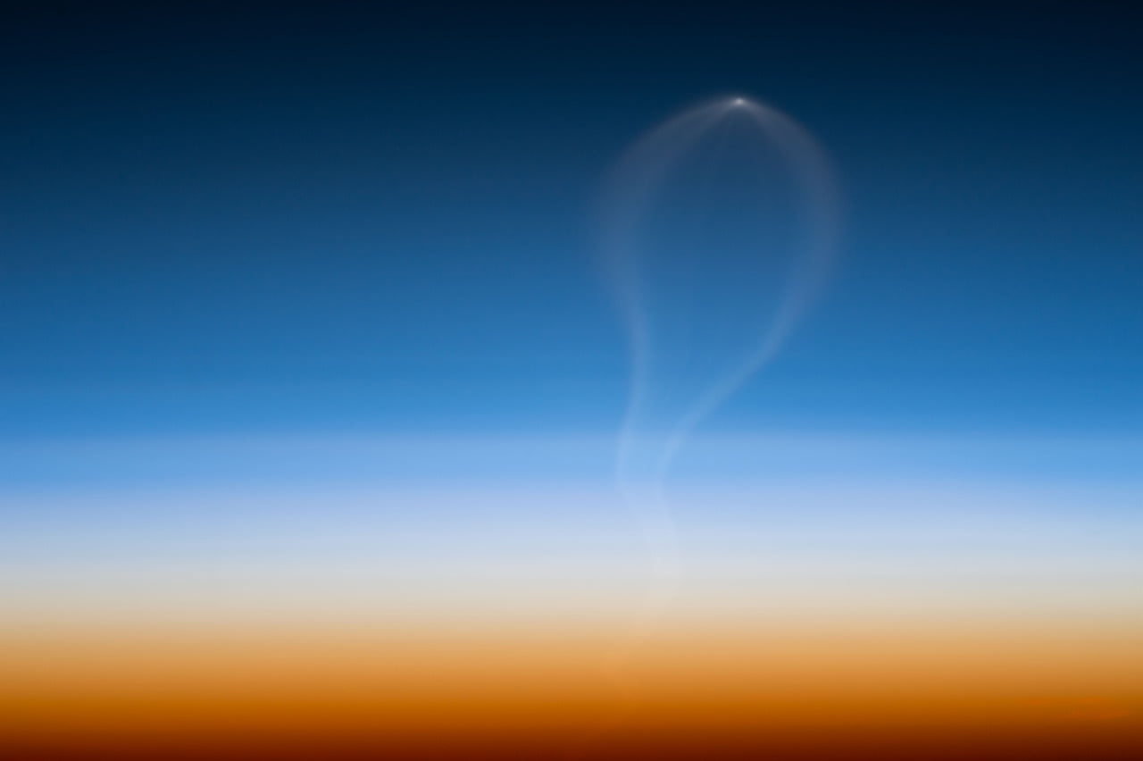 Rocket launches often produce spectacular imagery, but it’s rare to get a launch view quite like this one. The photograph above shows the recent launch of an Atlas V rocket as viewed from the International Space Station. The rocket itself is too small to be seen directly. Instead, that bright spot you see is the rocket’s exhaust. The smoky swooping curves mark the rocket’s exhaust plume. Because the gases leaving the rocket are at much higher pressure than the scant air pressure in the upper parts of the atmosphere, the exhaust expands rapidly, ballooning outward. Here the water vapor in the exhaust has frozen into crystals that catch the sunlight and make them stand out against the surrounding sky. (Image credit: NASA; via NASA Earth Observatory)