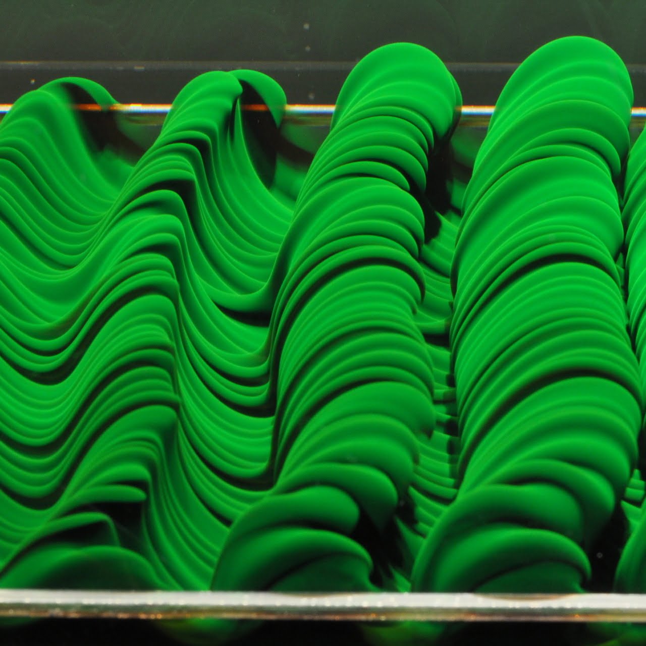 Here on Earth, placing a denser fluid over a lighter one creates an unstable equilibrium. Thanks to gravity, the heavier, denser fluid wants to sink and the lighter fluid wants to rise. Any small disturbance will kick this into action, just like a tiny nudge can send a ball rolling down the hill. For the fluid, that nudge manifests as waviness in the interface between the two fluids. That waviness will quickly grow into billows like those shown above as the Rayleigh-Taylor instability takes over and the heavy (clear) fluid trades places with the lighter (green) fluid. You’ve probably witnessed this effect yourself when pouring milk into iced coffee. To see it in action, check out the video of this experiment or my FYFD video on the Rayleigh-Taylor instability. (Image credit: M. Davies Wykes)