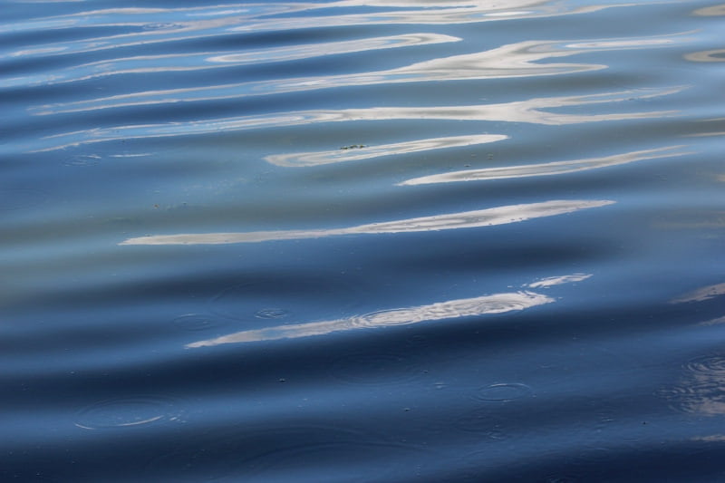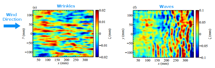 A recent study looked at just this question. By blowing air across the surface of different liquids and observing variations in the surface height as small as 2 micrometers, the researchers were able to measure tiny wrinkles on the water’s surface (lower left) when the wind speed was small. The size and shape of the wrinkles actually corresponds to structures in the turbulent air flow over the water! For fluids like water, there’s a smooth transition from wrinkles to waves as the wind speed increases, so both may be visible at the same time. For higher viscosity fluids, the switch from one to the other is more abrupt. (Image credits: water – M. Soveran; figure – A. Paquier et al. w/ annotations added in blue; research credit: A. Paquier et al.)
