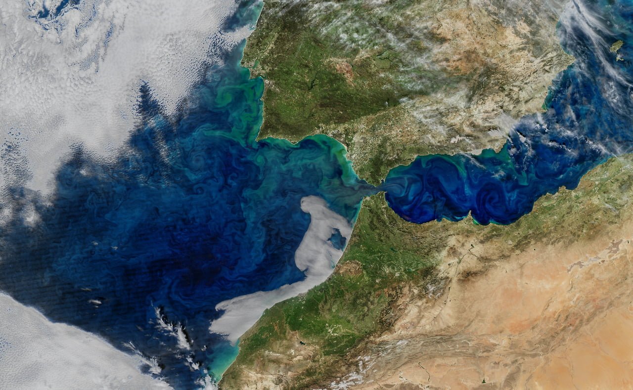 Swirls of phytoplankton make this satellite image of Gibraltar look like an Impressionist painting. The photo is a composite of data from several instruments, with colors enhanced to highlight features of the phytoplankton blooms. The tiny plankton act as tracer particles that reveal some of the complex flow between the North Atlantic and the Mediterranean. Although narrow, the Strait at Gibraltar has deep and complex terrain that was formed during a breach flood event millions of years ago. Water flowing through that terrain sets up enormous and complicated waves well beneath the ocean surface. These drive some of the turbulence that we see here as the blue swirls east of the Strait. (Image credit: NASA/N. Kurig; via NASA Earth Observatory)