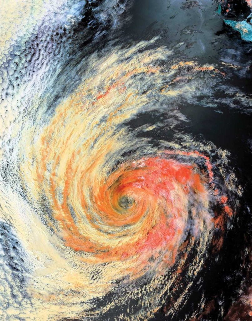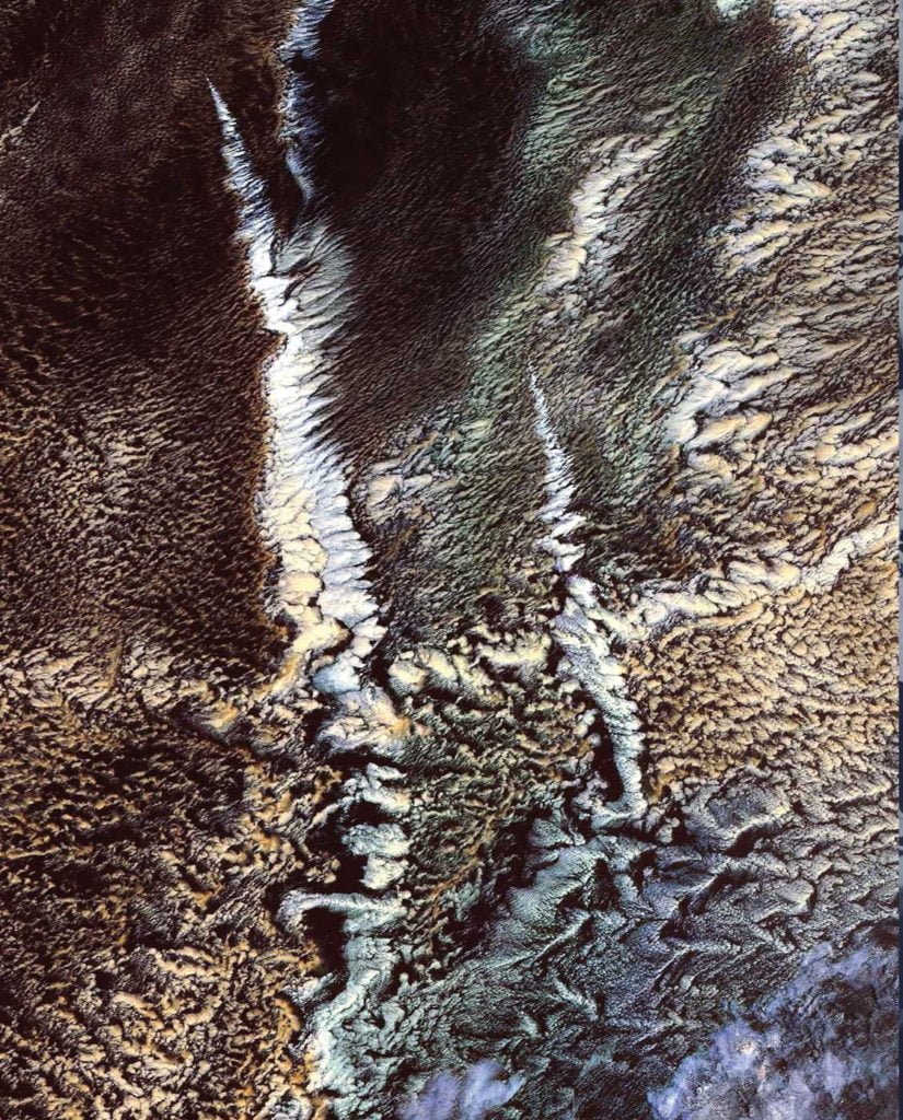 Fluid dynamics itself makes a solid showing in the book. Several letters are formed by vortices (like G above) and various types of clouds, including the ship track clouds (like H) that form when water condenses on aerosols released by ship exhaust. There are also meandering rivers, creeping glaciers, and erosion features among the letters.