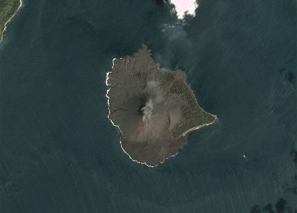 In late December 2018, a landslide on the island Anak Krakatoa triggered a deadly tsunami in Indonesia. The island (upper left, pre-landslide) lost an estimated 300 meters of height in the landslide, dramatically altering its appearance (upper right; post-landslide). Much of the slide occurred underwater, dumping material into a crater left by the famous 1883 eruption of Krakatoa.