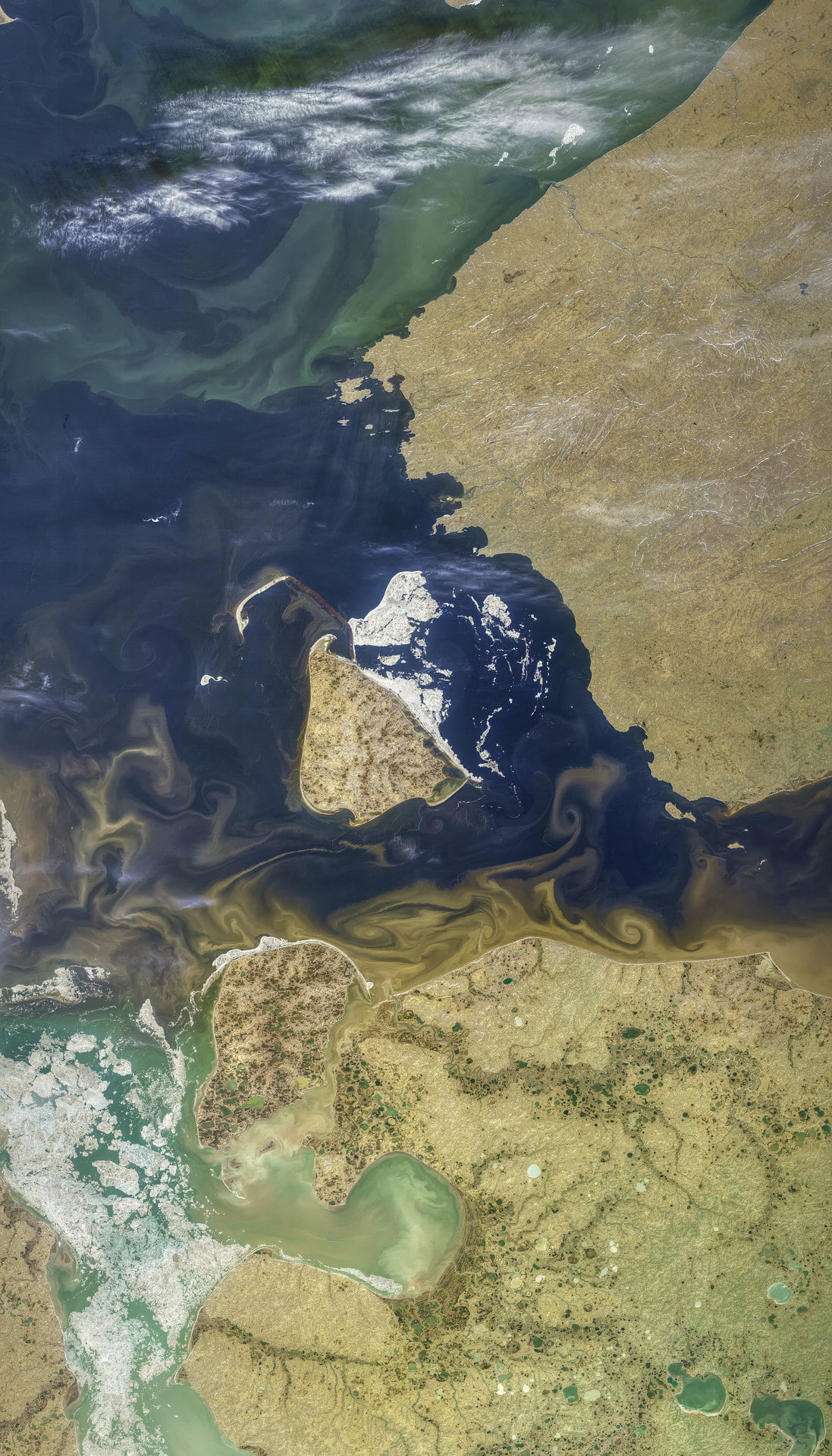 These colorful swirls show sediment and organic matter carried into the Arctic Ocean. Like dyes or tracer particles in a lab experiment, this run-off reveals the complicated patterns of mixing where freshwater and salt water mix. Delicate as they appear, these eddies are tens of kilometers across. Zoom in on the full resolution image to really appreciate the details, like the feathery edges between layers. (Image credit: N. Kuring; via NASA Earth Observatory)