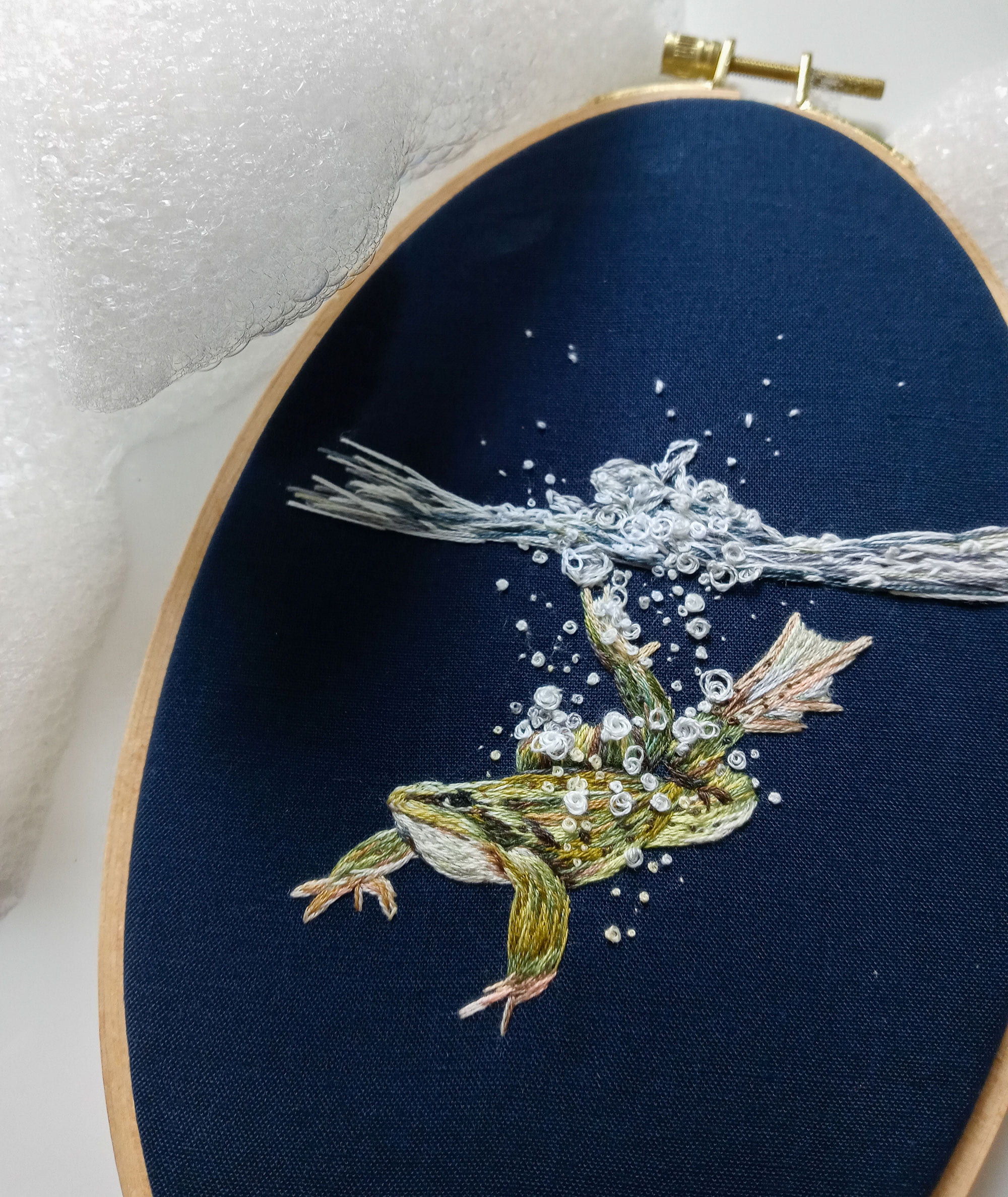 I love a good crossover between fluid dynamics and something unexpected. Fiber artist Megan Zaniewski uses thread-painting techniques to embroider ducks, frogs, otters, and other animals as they appear both above and below water. I am blown away by how she captures the movement and turbulence of water in these pieces! Just look at that spectacular frog splash. You can find lots more of her art on her Instagram. (Image credit: M. Zaniewski; via Colossal)