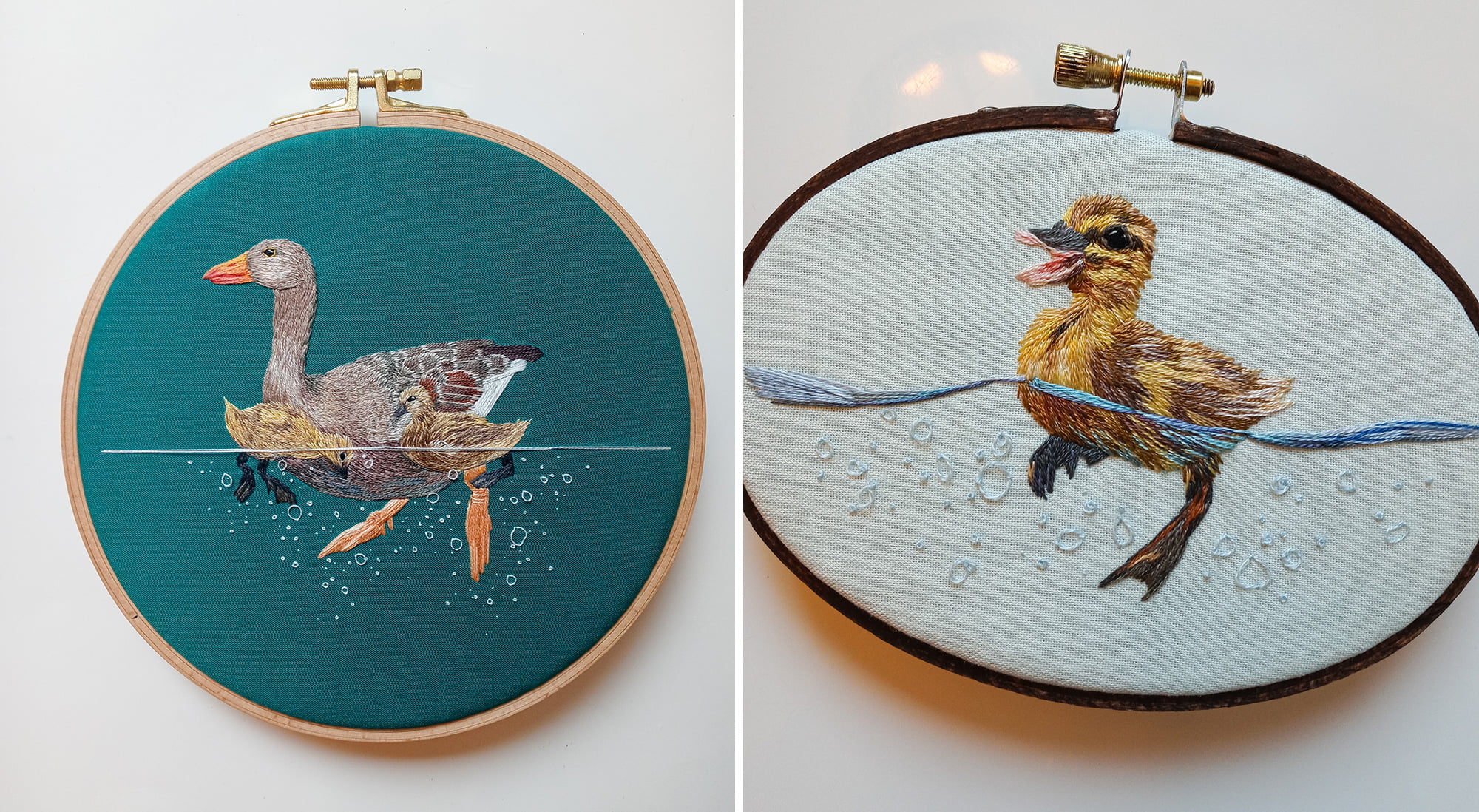 I love a good crossover between fluid dynamics and something unexpected. Fiber artist Megan Zaniewski uses thread-painting techniques to embroider ducks, frogs, otters, and other animals as they appear both above and below water. I am blown away by how she captures the movement and turbulence of water in these pieces! Just look at that spectacular frog splash. You can find lots more of her art on her Instagram. (Image credit: M. Zaniewski; via Colossal)
