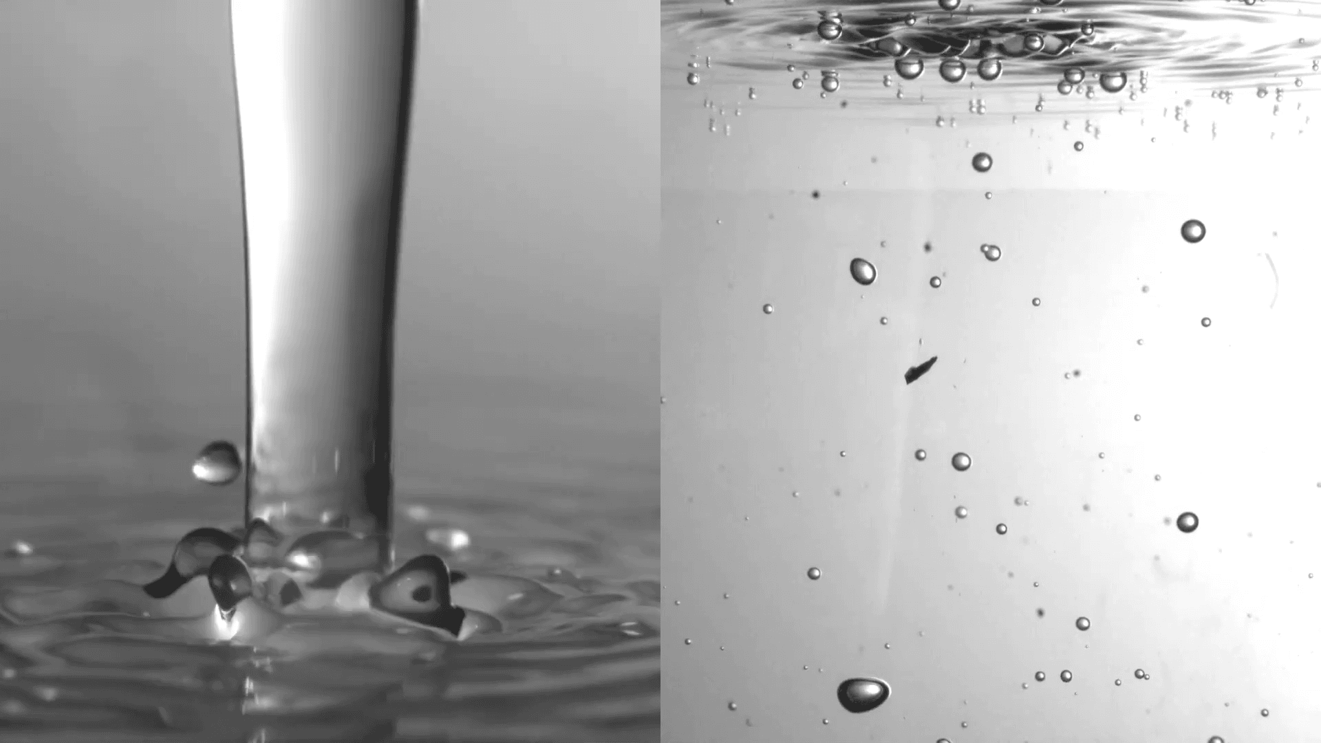 Every time I fill a glass at my refrigerator, I watch how the falling jet creates a cloud of bubbles. The bubbles form when the impacting water jet pulls air in with it, though, as this video shows, the exact origins can vary. Here, researchers take a closer, slowed-down look at the situation; they connect disturbances in the jet and waves at its base to the entrained bubbles that form. (Video and image credit: S. Relph and K. Kiger)