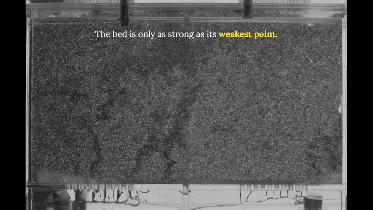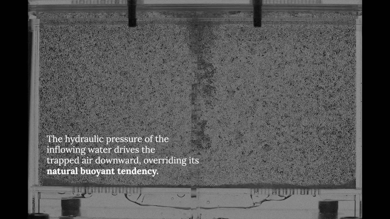 We often rely on water draining through beds of grains, whether it’s the soil foundation beneath a building or the sand-and-gravel-filter used in water treatment. But how does water move through these tortuous porous passages? That’s what we see in this video, which places grains in a jig resembling an ant farm and lets us watch as water–and air–drain through the grains. The result is more complicated than you might imagine, with dry pockets, weak spots, and developing sinkholes. (Video and image credit: J. Choi et al.)