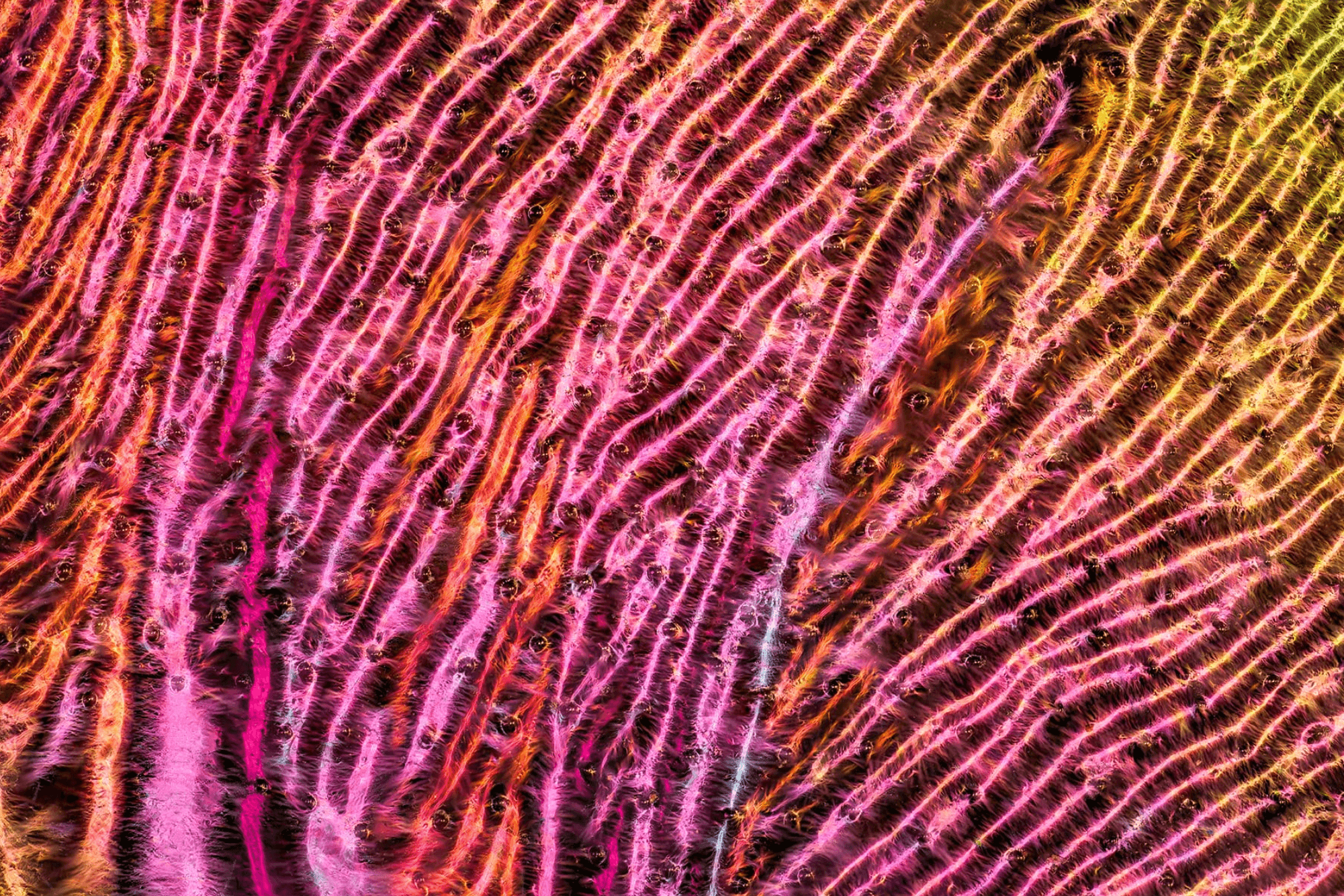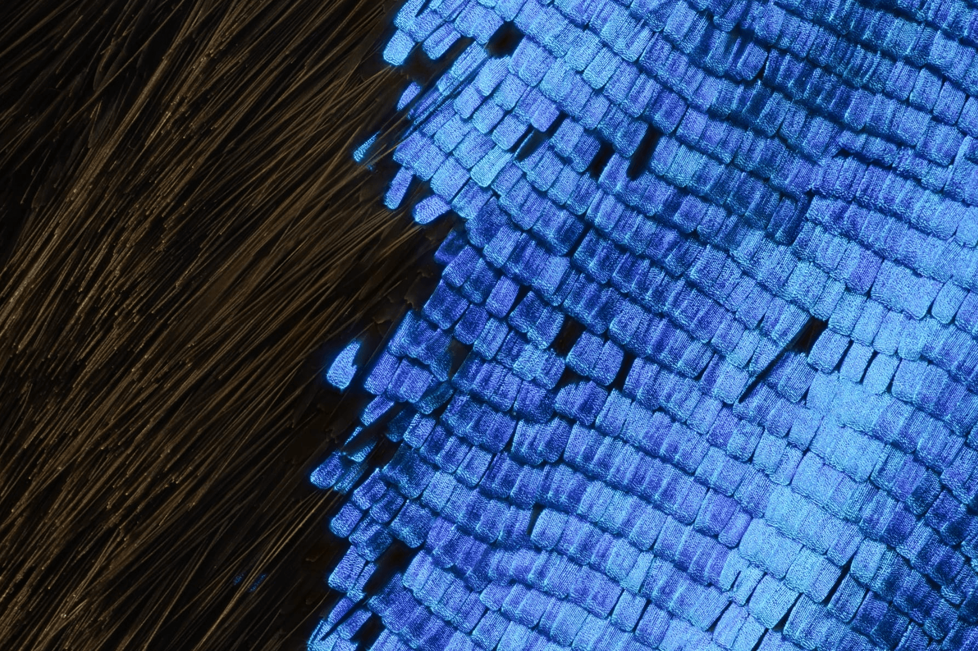 Photographer Chris Perani is fascinated by the microstructures of insect wings, which he captures in “extreme macro” through focus stacking–letting us see wings in glorious micron-scale detail. In addition to giving insects their brilliant colors and irridescence, these structures serve another key role: they help insects stay dry. In a world where contact with water is unavoidable, insects have instead evolved to trap air in the gaps of their wings, letting water slide off instead of sticking. (Image credit: C. Perani; via Colossal)