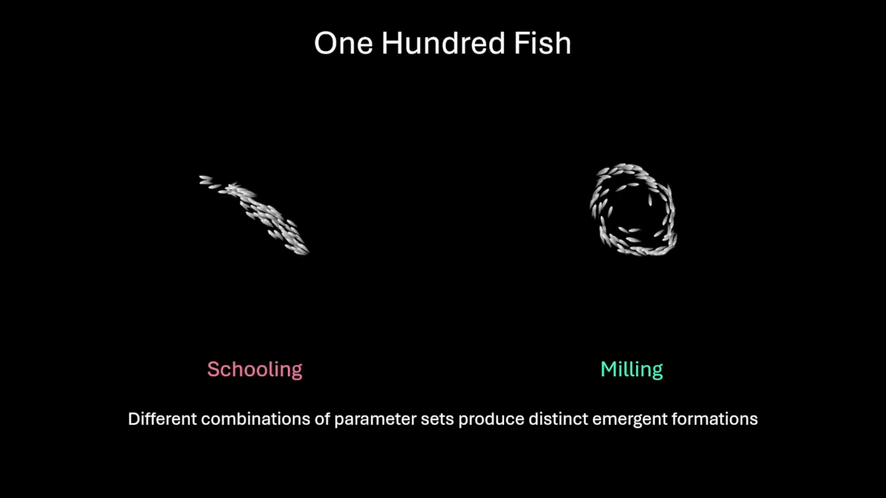 Relatively simple visual and hydrodynamic signals are enough to make digital fish school in ways that resemble living ones. Here, researchers look at what happens when well-behaved schools of fish get too big. The researchers first demonstrate that their schools behave reasonably at one hundred members, either in a schooling configuration or a group milling around a central region.