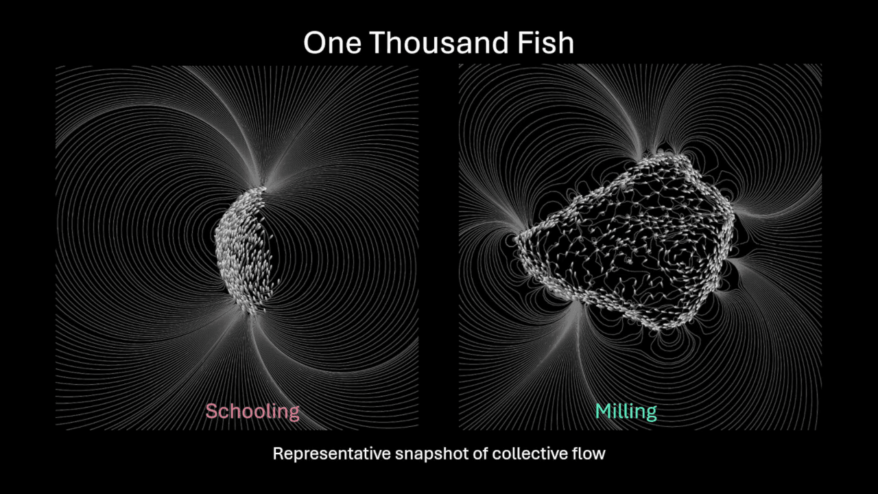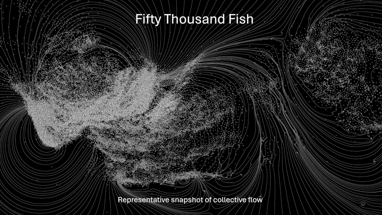 At one thousand fish, the schools are still reasonably coherent and sensible. But at fifty thousand fish, the picture is drastically different. Neither schooling nor milling groups are able to remain together. They fracture and scatter into smaller groupings. (Video and image credit: H. Hang et al.)