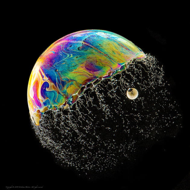 Surface tension draws bubbles into spheres, but the balance of forces holding the sphere together is delicate. When pierced by a projectile, sometimes soap films can heal themselves, but often the film ruptures. Once a hole forms in the bubble, the film’s integrity is lost. Instead of holding the bubble together, surface tension pulls the soap film apart in a spray of thread-like ligaments that break into droplets. In the blink of an eye, the bubble is gone. (Image credit: W. Horton)