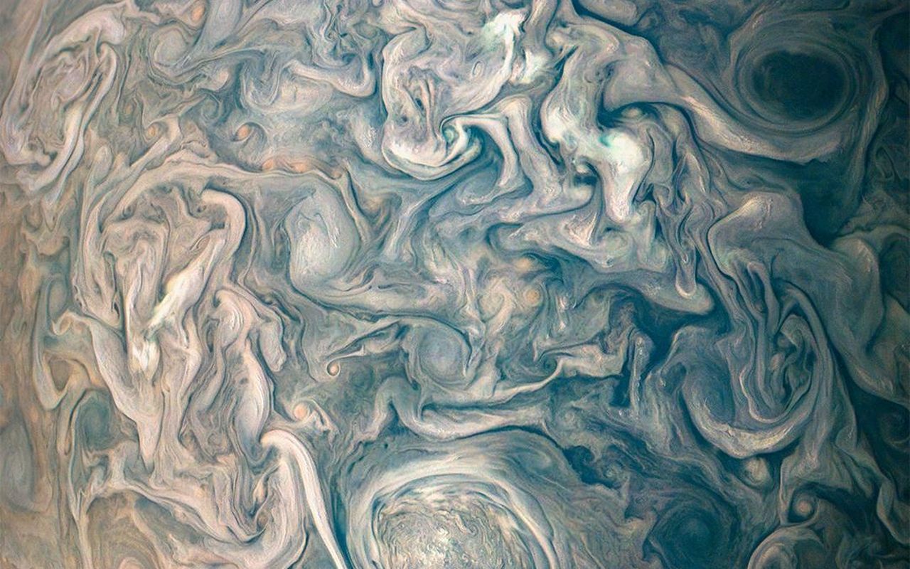 The swirling clouds of Jupiter hide a complicated and mysterious interior. For decades, scientists have worked to puzzle out the inner dynamics of Jupiter’s atmosphere and what could be going on inside it to generate the flows we see visibly. Near Jupiter’s equator, we see strong jets that flow either east or west, depending on their latitude; this creates the stunning cloud bands we’re used to seeing on the planet. Toward the poles, though, things look more like what we see above – swirling but unbanded.