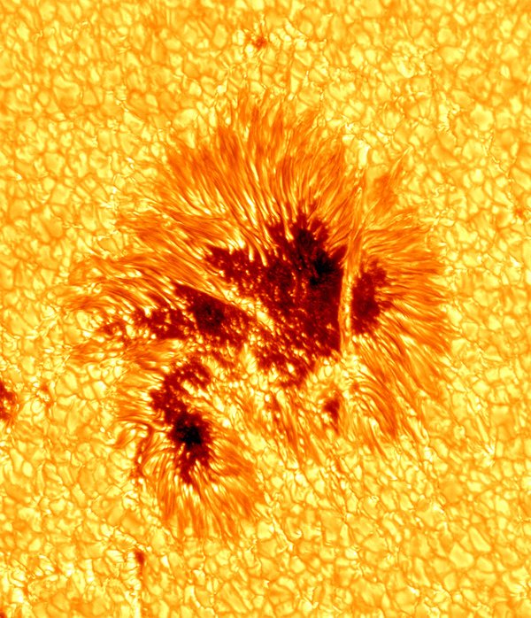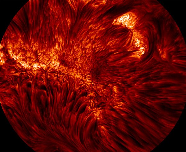 New photographs showing ultra-fine structure in the sun’s chromosphere and photosphere have been released. They offer a fascinating view into the magnetohydrodynamics of the sun, where the fluid behaviors of plasma are constantly modified by the sun’s magnetic field. The left image shows fine-scale magnetic loops rooted in the photosphere, while the right image shows our clearest photo yet of a sunspot. The dark central portion is the umbra, where magnetic field lines are almost vertical; it’s surrounded by the penumbra, where field lines are more inclined. Further out, we see the regular convective cell structure of the sun. (Photo credit: Big Bear Solar Observatory/NJIT; via io9 and cnet)