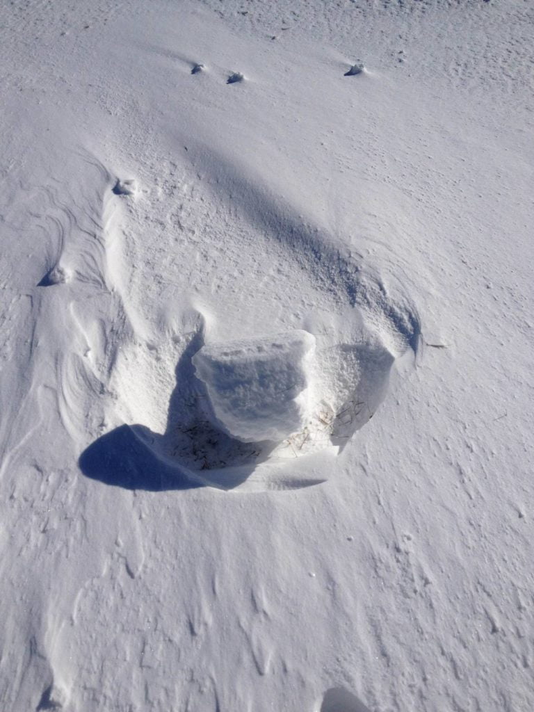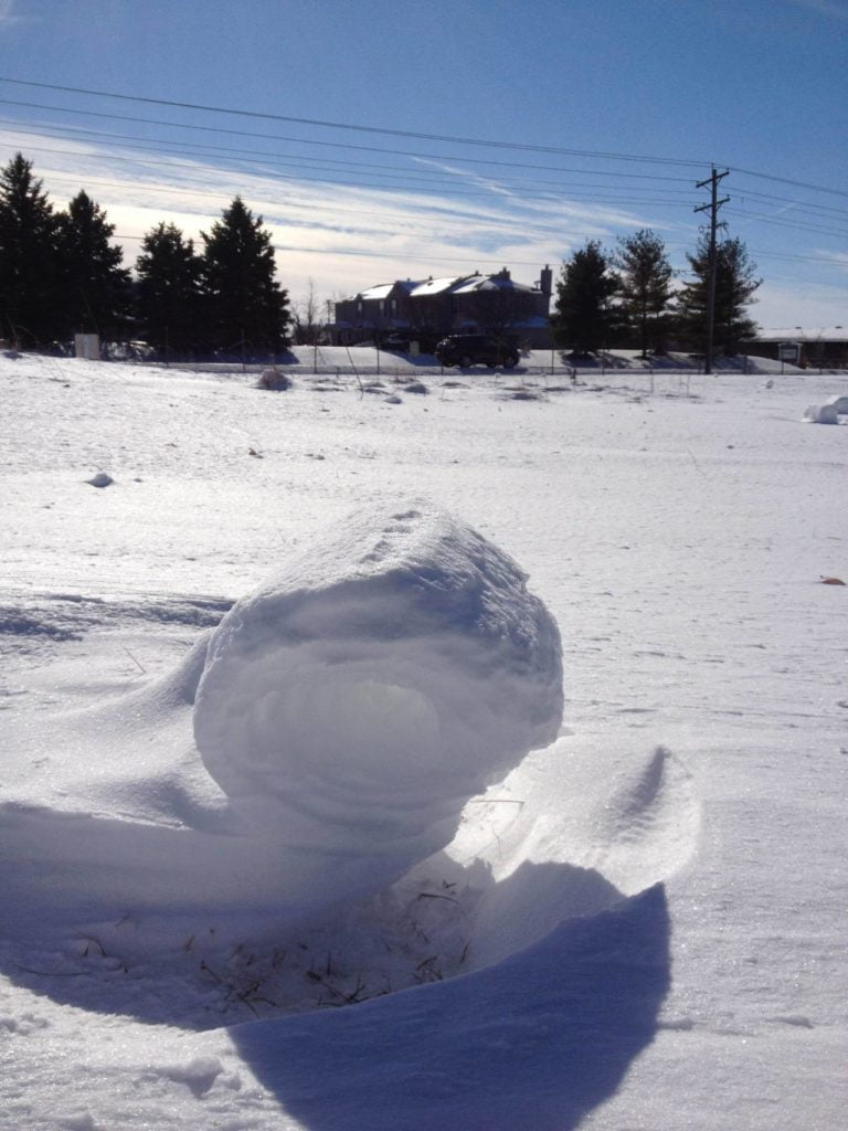 Snow rollers are nature’s snowballs, formed when high winds roll a chunk of snow along the surface, allowing it to accumulate more and more material. They occur relatively rarely because their appearance is the culmination of several specific meteorological factors. To form rollers, the ground needs to be icy, with a layer of loose, wet snow above the ice. And, of course, it needs to be windy enough to move the snow without being so windy that snow breaks up. In the photos above, the snow roller got too large for the wind to continue moving it, but the wind didn’t stop blowing. Instead, the snow roller became an obstacle to the flow and a horseshoe vortex formed at its base. The spinning of the vortex dug out the trench in front of and along the sides of the snow roller. This same effect is often seen on the windward side of trees in winter. (Photo credit and submission: S. Benton)
