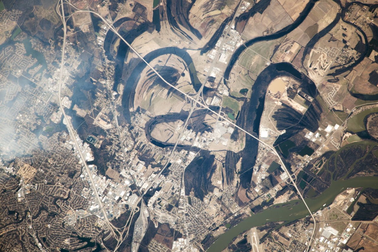 When unconstrained by the local topography, rivers tend to meander, as shown in this astronaut photograph of the Arkansas River near Little Rock, AR. The current course of the river is visible in green in the lower right hand corner of the image, but numerous lakes and curved banks show some of the former paths the river took. When rivers develop a bend, flow is faster on the inner bank than around the outer bank. This speed difference causes a vortical secondary flow inside the river that removes sediment from the outer bank and deposits it on the inner side. The end result is that the bend in the river gets sharper and the river meanders further. Sometimes the bends get so sharp they pinch off, leaving behind lakes. (Photo credit: Exp. 38/NASA Earth Observatory)