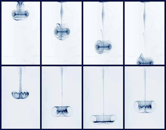 What does the flow look like around a spinning top? Here, researchers used dye to visualize what happens in a Newtonian fluid (like air or water) as well as a viscoelastic fluid. The Newtonian fluid (upper images) divides into two circulating zones, one below the top and one above. They both take the shape of a toroidal, or donut-shaped, vortex, visible here in cross-section.