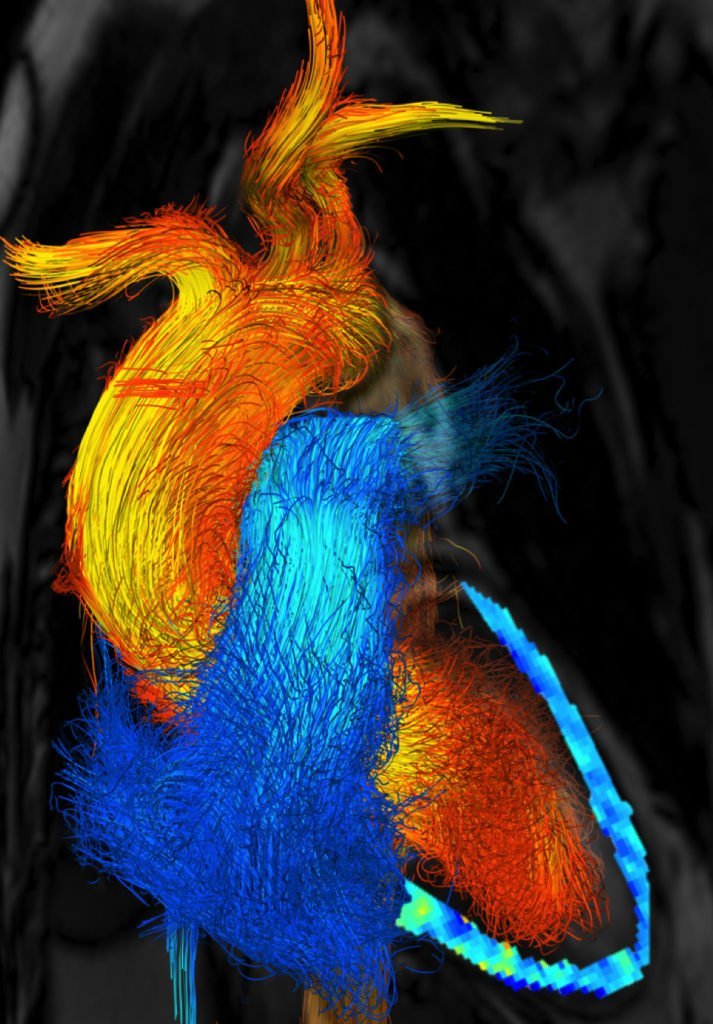 But for individuals with a leaking aortic valve (bottom of poster), things look different. Blood leaks back through the aortic valve at the same time that the mitral valve opens to allow freshly oxygenated blood back in. The two inflows disrupt mixing in the chamber, and, instead of pumping fully-oxygenated blood into the body, the left ventricle has to struggle to pump a less-oxygenated mixture into the body. (Image credit: G. Di Labbio et al.)