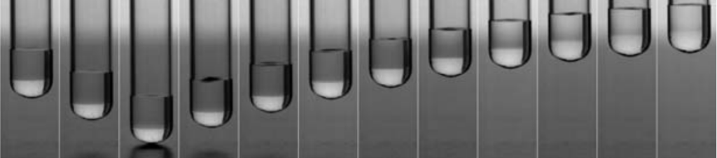 - Settling in Straws- At some point in your life, you’ve probably stuck your finger over the end of a straw and used it to pick up the liquid you’re drinking. If you lift the straw so that the end is still in your drink and remove your finger from the top, the liquid level in the straw will drop, then bounce up and down a couple times before it settles. This is what we see happen in the series of snapshots in the top image. Eventually, the liquid level settles at its equilibrium position, marked by the red arrow at the far right. - The liquid has to bounce before settling because capillary forces and the liquid’s inertia are battling it out moment by moment. Just how long the rebound takes depends on the initial height of the fluid and the depth the straw is immersed at, but it doesn’t depend on the fluid’s viscosity. Lower viscosity fluids do sometimes have a neat jet (bottom image) that forms at the immersed end of the straw, though. (Image and research credit: J. Marston et al.)