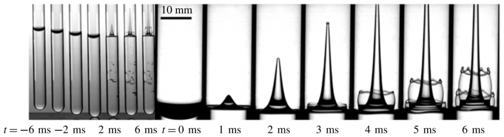 - Crowns On Impact- Dropping a partially-filled test tube of water against a table makes the meniscus at the air-water interface invert into a jet of liquid. In some cases, the impact is strong enough to generate splashing crowns of water around the base of the jet. These crowns come in two forms – one with many splashes layered upon one another and the other with only a few splashes and a faster jet. - The many-layered splash crowns come from the pressure wave that reflects back and forth from the bottom of the tube to the surface and back. This pressure wave moves at the speed of sound and vibrates the water surface, creating the many splashes. The same reflected pressure wave occurs in the second type of splash crown, but it gets disrupted by cavitation bubbles that form in the water (visible in the lower left image). Instead the splash crowns form from the shock waves generated when the cavitation bubbles collapse. (Image credits: A. Kiyama et al.)
