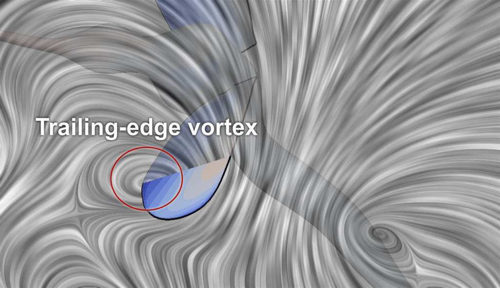 Like most flapping fliers, the mosquito generates a leading-edge vortex during its downstroke (and its upstroke). This vortex helps concentrate low pressure on the upward-facing wing surface, thereby creating lift. One of the things that makes the mosquito unique, however, is that it also creates trailing-edge vortices on both half-strokes. To do this, the mosquito rotates its wings precisely to catch the wake of its previous half-stroke. The flow gets trapped near the trailing edge of the wing and forms a vortex and low-pressure region. Like the leading-edge vortex, this low-pressure area on the upward-facing wing surface creates lift. For more secrets of mosquito flight, check out this video from Science or the original paper. (Image credit: R. Bomphrey et al., source)