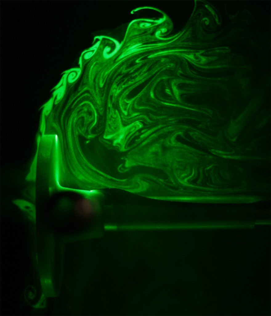 One of the common themes in aerodynamics, especially in sports applications, is that tripping the flow to turbulence can decrease drag compared to maintaining laminar flow. This seems counterintuitive, but only because part of the story is missing. When a fluid flows around a complex shape, there are actually three options: laminar, turbulent, or separated flow. An object’s shape creates pressure forces on the surrounding fluid flow, in some cases causing an increasing, or unfavorable, pressure gradient. When this occurs, fluid, especially the slower-moving fluid near a surface, can struggle to continue flowing in the streamwise flow direction. Consider the video above, in which the flow moves from left to right. Near the surface a turbulent boundary layer is visible, where fluid motion is significantly slower and more random. Occasionally the flow even reverses direction and billows up off the surface. This is separation. Unlike laminar boundary layers, turbulent boundary layers can better resist and recover from flow separation. This is ultimately what makes them preferable when dealing with the aerodynamics of complex objects. (Video credit: A. Hoque)