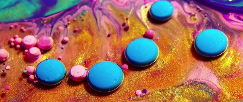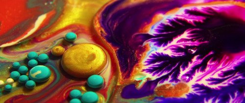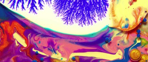 Oil, paint, and soap combine to create a polychrome landscape in Thomas Blanchard’s “Kingdom of Colours” short film. Colorful droplets of paint coated in oil form anti-bubbles that skim along the liquid surface until they burst, dispersing new colors. One of my favorite touches in this video, though, are the branching fingers of color that appear repeatedly (most often in blue-violet). This is an example of a phenomenon known as the Saffman-Taylor instability. It’s a hallmark of a low viscosity fluid pushing into a higher viscosity one–like air into honey. (Image/video credit: T. Blanchard; via Flow Vis)