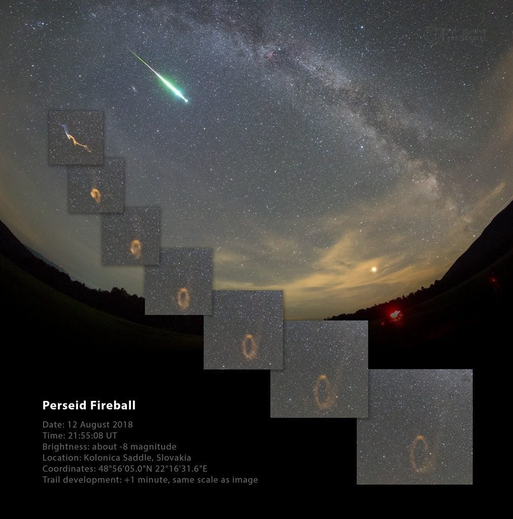 During the recent Perseid shower, photographer Petr Horálek caught an awesome timelapse of an exploding meteor and the vortex ring it created. This is a type of persistent train left when meteors pass through the upper atmosphere. The exact physics are not well understood because such events are difficult to observe; catching them at all is basically just happenstance. But one interpretation is that we’re seeing trails of plasma left by the ionization of parts of the meteor. When the meteor hits the upper atmosphere, there’s an extremely strong hypersonic shock wave. The jump in temperature across that shock wave is enough to pull atoms apart, creating a plasma. The train left by this meteor’s demise was faintly visible even an hour after the fireball. (Image credit: P. Horálek, video version; via APOD; submitted by Andrea S.)